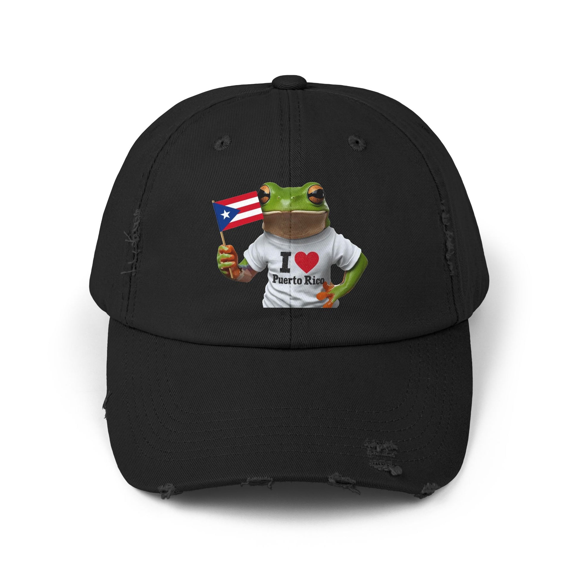 Puerto Rico Love Distressed Cap | Fun Frog Design | Unisex Adjustable Hat | Great for Summer, Festivals, Vacations, Gift Ideas